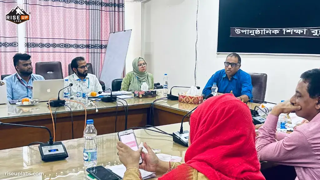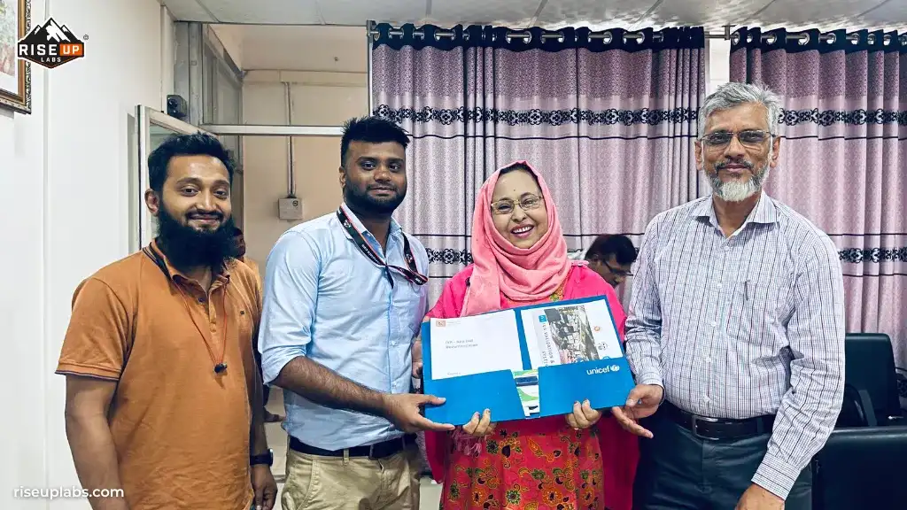 From UNICEF Bangladesh Education Specialists Mohammad Rafiqul Islam and Shamima Siddiky attended the IVA Validation & Monitoring System app handover program. Rakib Hasan Dipu, and Md. Mizanur Rahman from Team Riseup Labs handed over the project to the Client.